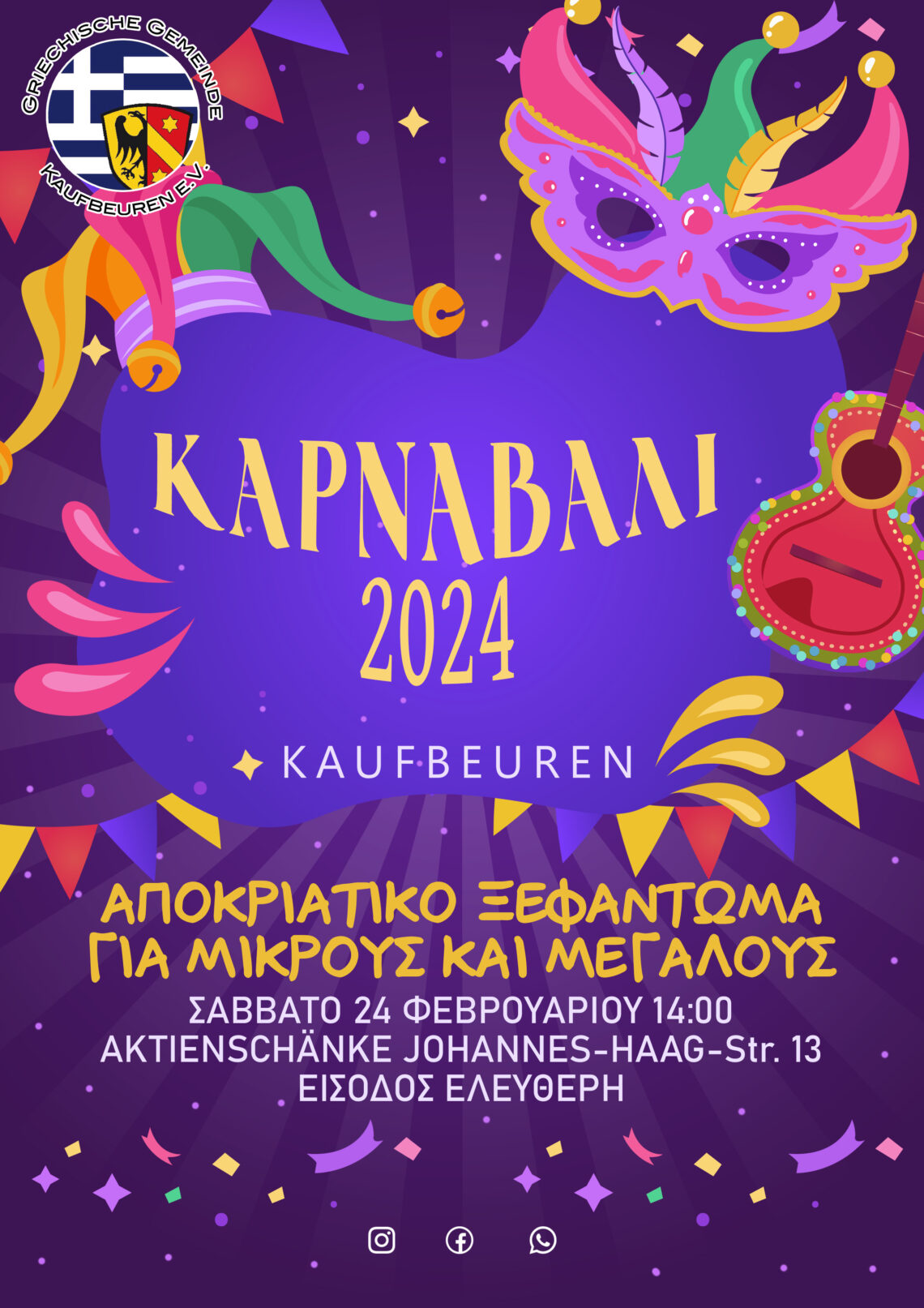 Σας προσκαλούμε να μας συνοδεύσετε σε ένα αποκριάτικο πάρτι γεμάτο χαρά και διασκέδαση! Η εκδήλωση θα λάβει χώρα το Σάββατο, 24 Φεβρουαρίου, στις 14:00, στο εστιατόριο Aktienschänke Johannes-Haag-Str. 13.