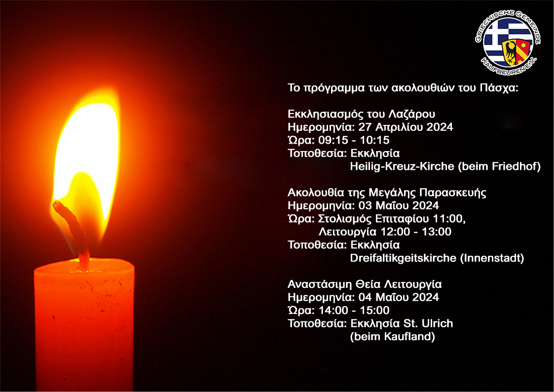 Τοποθεσία: Εκκλησία St. Ulrich (beim Kaufland)Ελπίζουμε να μας τιμήσετε με την παρουσία σας σε αυτές τις Άγιες ημέρες του Πάσχα.