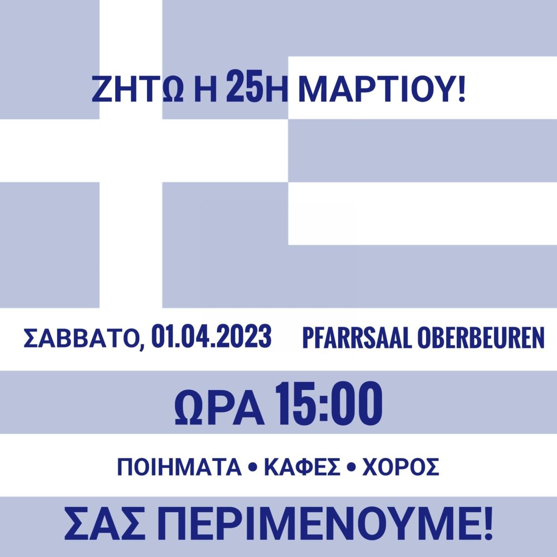 με μεγάλη χαρά σας προσκαλούμε στη γιορτή για την επέτειο της 25η Μαρτίου 1821 που θα πραγματοποιηθεί στο Pfarrsaal Oberbeuren (Hauptstraße 4, 87600 Κaufbeuren) το Σάββατο, 01.04.2023 στις 3 μ.μ.